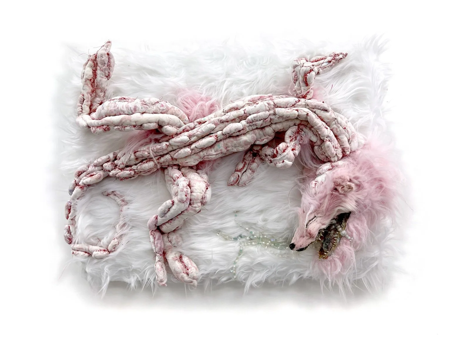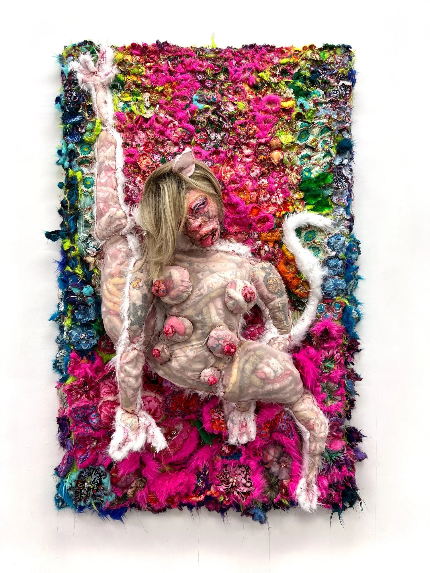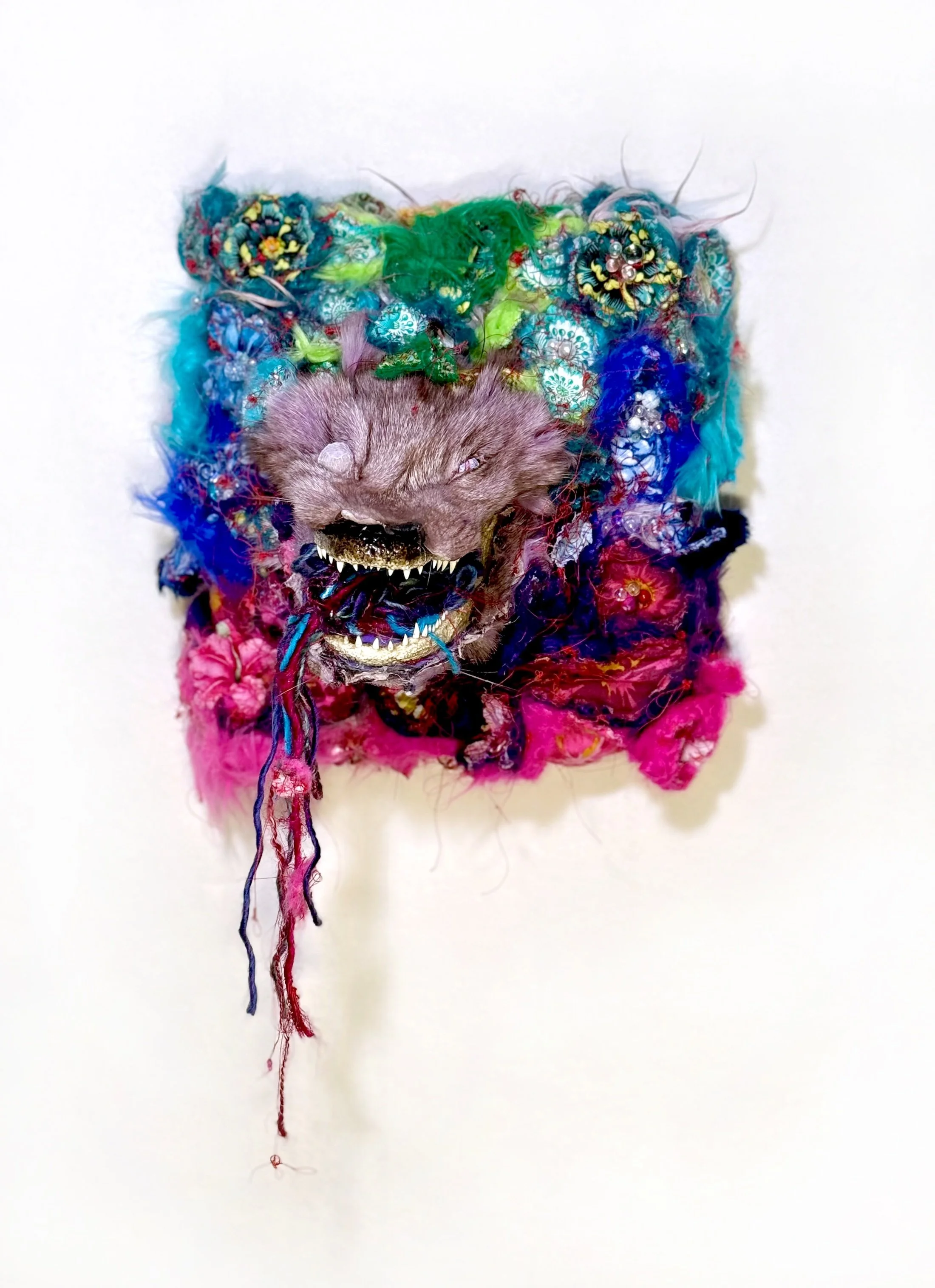 Faux fur, yarn, glitter, and upcycled taxidermy transform through Boehmer’s aggressive stitching-together, into colorful, grotesque sculptures. These soft hybrids assume a wild humorous view of the artist’s fears and fantasies about death and aging, vitality and rot.